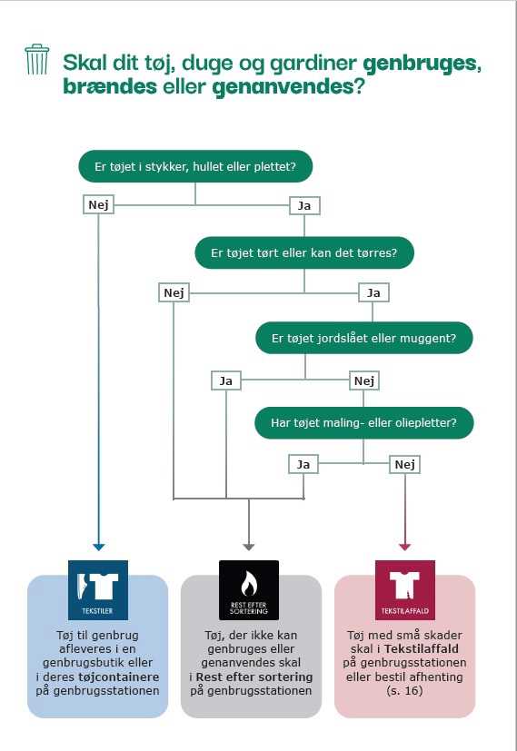 Tekstilaffald: Indsamles to gange om året. Tekstilerne skal stilles frem i lukkede poser eller klare sække. Men husk! Du skal bestille afhentning af dit tekstilaffald senest tre hverdage før din afhentningsdato.