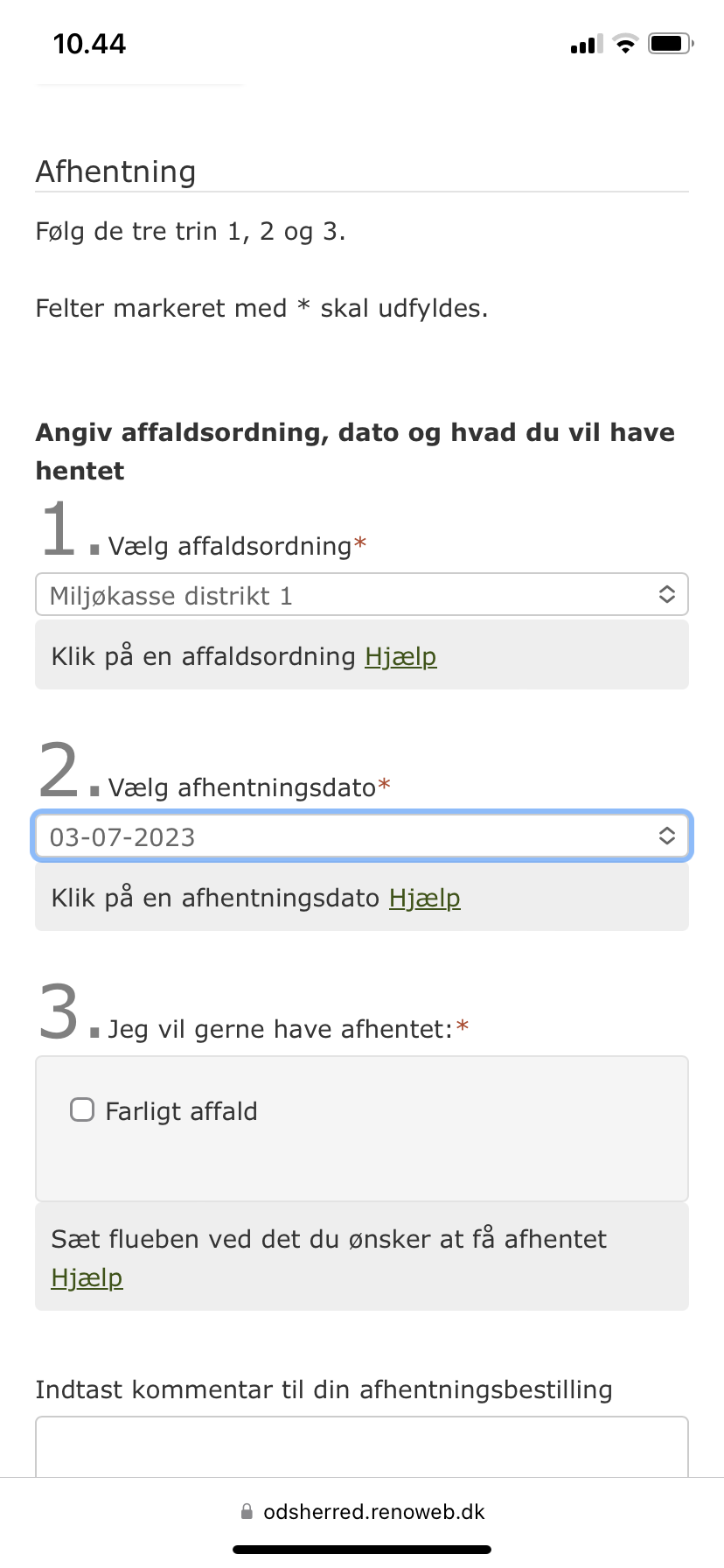 Brug selvbetjeningsløsningen øverst på siden, hvis du ikke har fået hentet dit store indbo og tekstilaffald.