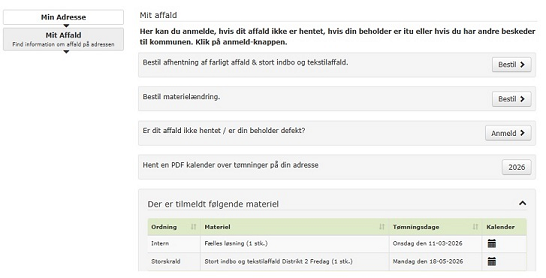 - Find din tømmekalender - Bestille afhentning af Miljøkassen og Stort indbo - Giv besked hvis en beholder ikke er tømt eller i stykker - Bestille en ekstra beholder - Se dine ordninger