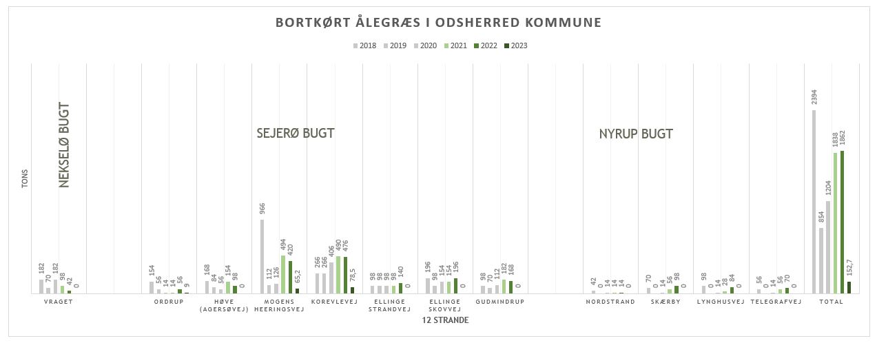 Sommeren 2023 artede sig vejrmæssigt specielt med en meget tør forsommer - efterfulgt af massive mængder regn i juli. Vind og strøm opførte opførte sig også anderledes: Mængden af opskyllet ålegræs var mindre end normalt - og sammenholdt med ny praksis for rydning af ålegræs har vi i 2023 kørt 152,7 tons væk til nedpløjning mod betydeligt større mængder i de forgangne år.