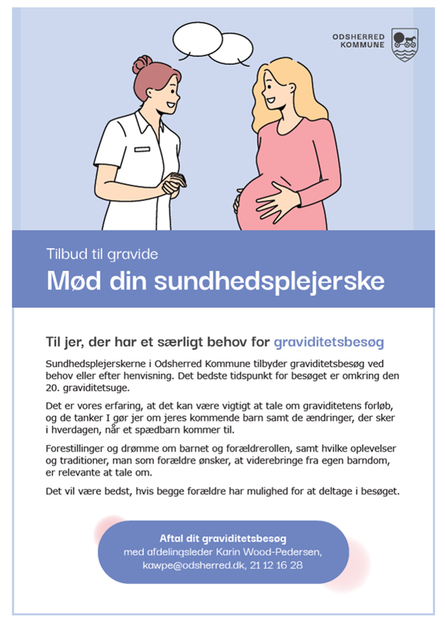 Sundhedsplejerskerne i Odsherred Kommune tilbyder graviditetsbesøg ved behov eller efter henvisning. Det er vores erfaring, at det kan være vigtigt at tale om graviditetens forløb og de ændringer som kommer til at ske i hverdagen, når et spædbarn kommer til og at det bedste tidspunkt for et graviditetsbesøg er omkring graviditetsuge 16-24.
